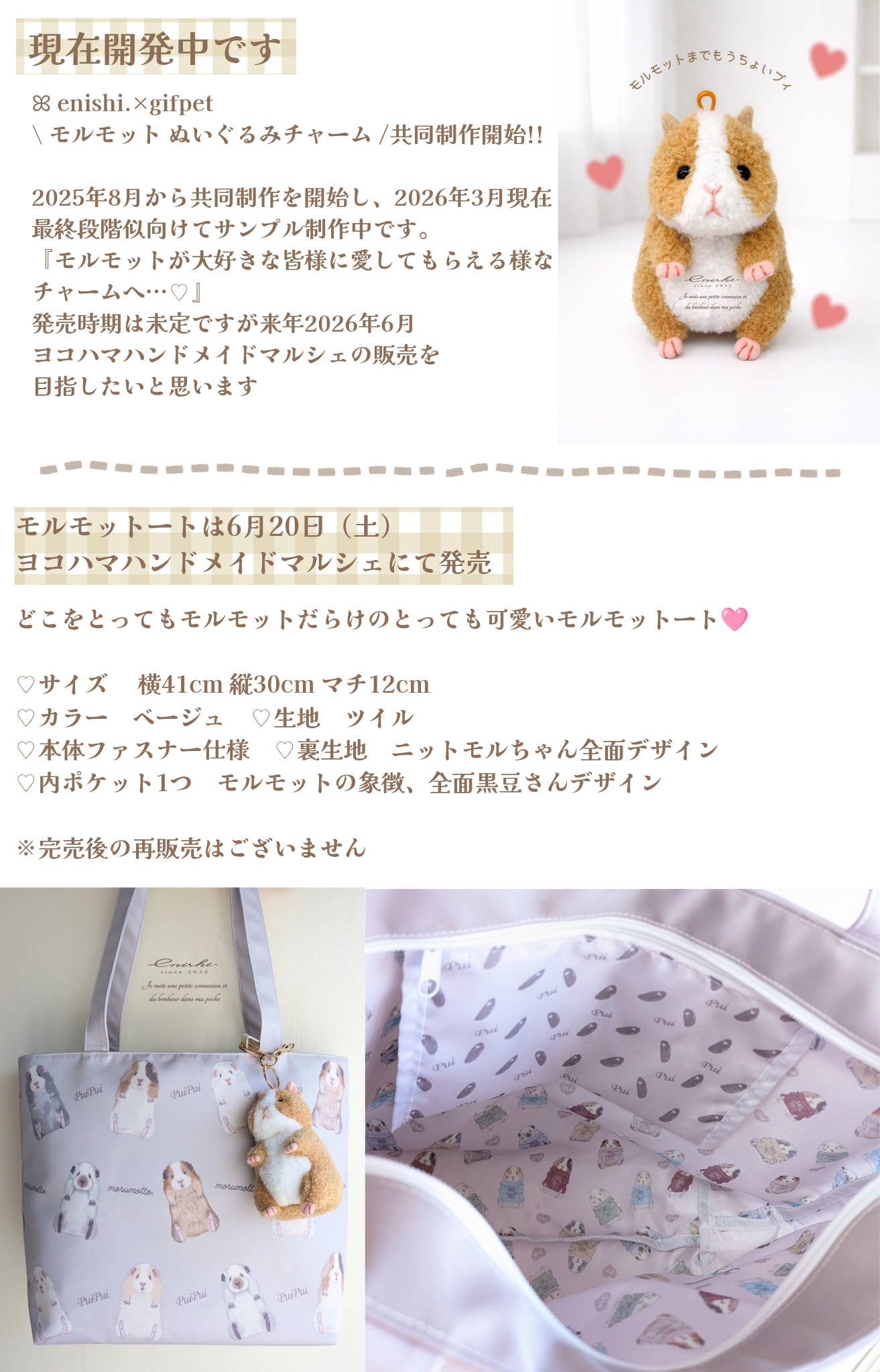 【ご予約商品】 モルモット刺繍ワッペンショルダー ✕LIBERTY(リバティ) 『どデカちゃん』 ※今回ご注文分より、モルモットワッペン蓋部分のリバティー生地が、全てクリーム色で使用している茶系のリバティー生地となります。 (お写真一番最後に今回からの組合せカラーが載っています) enishi.のこだわりがたっぷり詰まった 大人のモルモットショルダーです。 モルモット部分は全ての刺繍糸のカラーにも こだわったenishi.オリジナルの 刺繍ワッペンでとても綺麗です。 花柄生地はLIBERTY リバティを使用 リバティの中でも落ち着いた色味をチョイスしました。 中のポケットはモルモットと言えば大好きなチモシー♡ ウィリアムモリス "Willow Bough" ウィロー・バウ を使用した、チモシーに見立てたデザイン 外にはファスナーポケット サイドの留め具は本革を使用しています。 (本革部分にはコーティングも兼ねて ミンク油を塗ってあります) くたっとならない、しっかりとした ショルダーバッグとなっています。 ✤サイズ 縦16.5cm 横23cm マチ5cm モルモットの存在感がたっぷりな ショルダーバッグですが 肩にかけると不思議と自然になじんでしまう お洒落モルモットに変身します♡ お出掛けやモルモットのイベントなど 普段使いにも、いつでもモルモットと一緒に お出掛けしてくださいね♡ カラーは2種類ございます。(写真1枚目参考) ①茶色 ②クリーム(黄色寄り) ※グレーは全て完売しました ※こちらはご予約商品です。 制作にお時間を頂戴いたします。 発送予定は4月下旬です。 (完成次第発送となりますので、早まる事もあります) ご注文後、こちらから一度ご連絡いたします。 発送はゆうパック郵便、段ボールにて発送となります。
